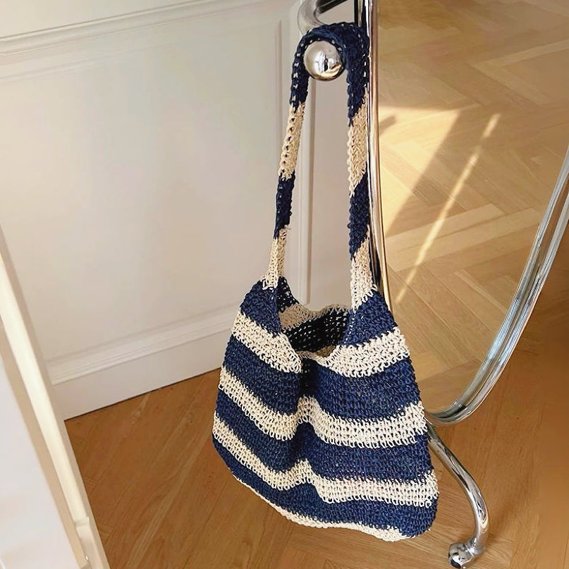 Gehäkelte Tragetasche aus Stroh mit blauen Streifen